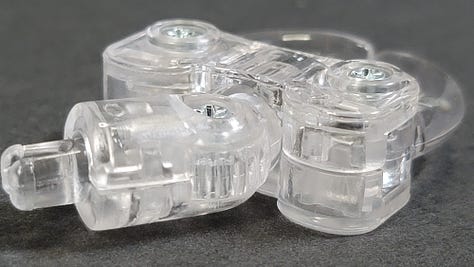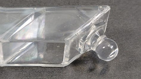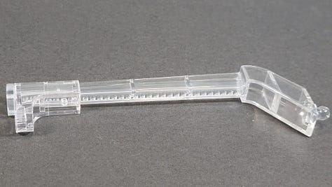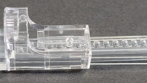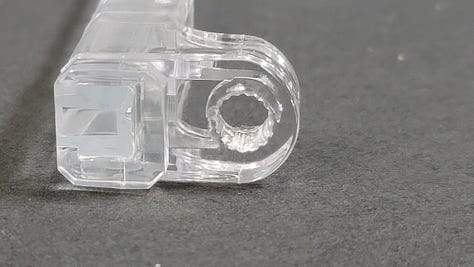 5) The extender arm has a grooved clip that allows for some flex for clipping in and removing (though removing is a bit more work). Like the hole in the adjustable arm, the extender arm has noticeable grooves in its receiving end which helps keep from moving if another extender arm or the claw is in place
