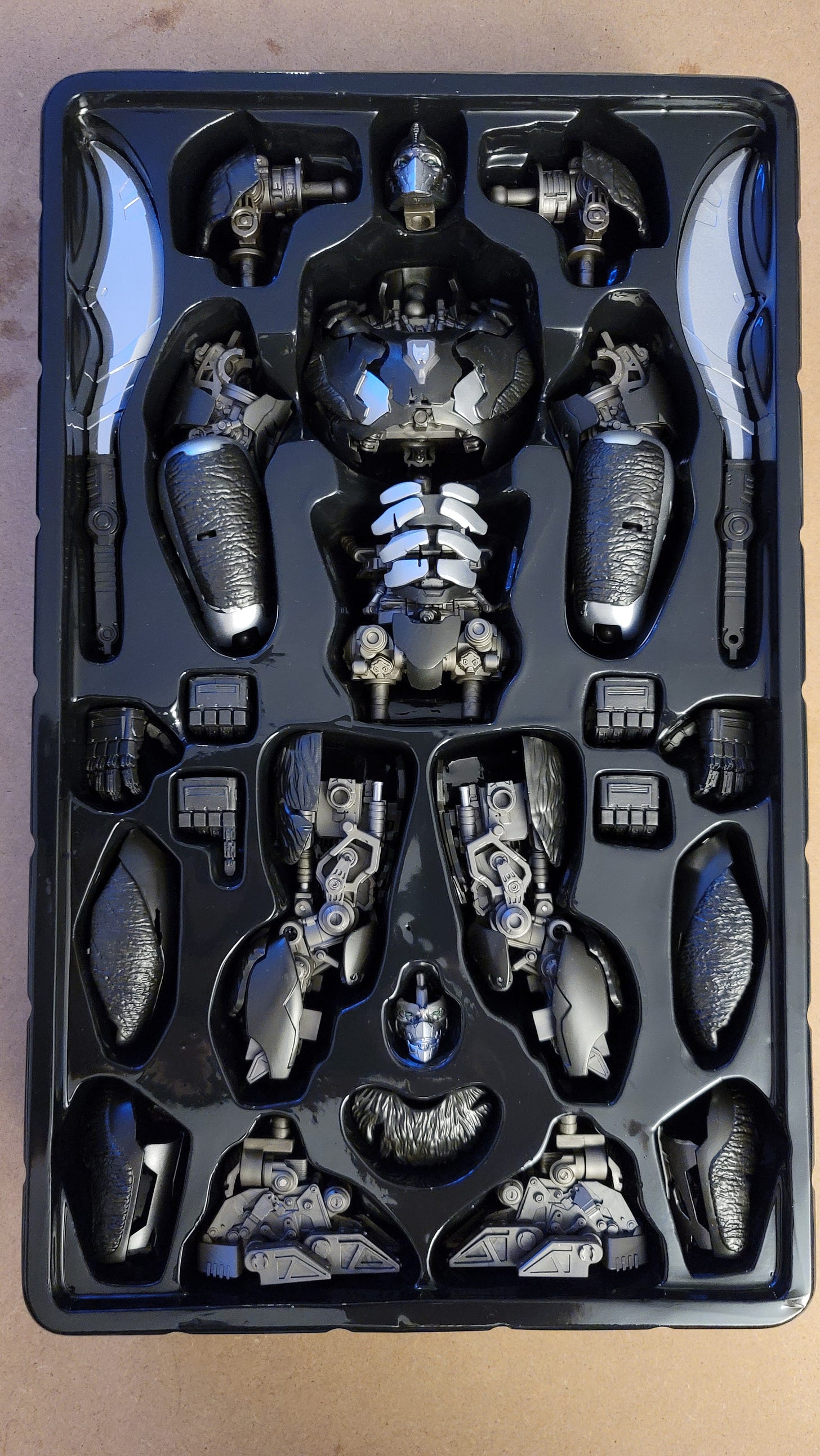 Putting him together was a sna… (nope)… was very easy, but a few of the pieces required a lot of pressure to get into place. I suppose I could have put them in hot water or taken a hair dryer to them, but I got there. Primal’s torso has a lot of intricate machinery details and I was gripping him too tight when putting a shoulder in place, and one of the detail bits broke off. It’s not even really noticeable but I know it happened and now it will always bother me, if only a little.