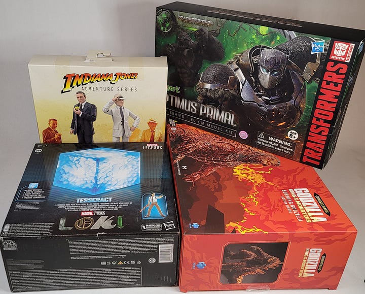 Defender Strange and Loki + Tesseract were bout bought by Lady Kent on a Boxing Day + Clearance sale. The Masters of the Universe figures were found for $10 a piece at a local discount toy store. The Optimus Primal Kit and Godzilla were pre-orders that arrived shortly before Christmas so I tucked them under my tree, and the Indiana Jones figures was a find by Lady Kent, with, possibly, a mis-priced sticker (it was $20 cheaper than most retailers).