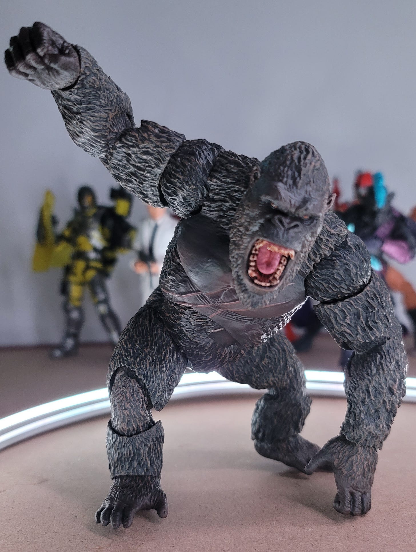 While he is a fierce looking ape, like Godzilla, I am pretty disappointed in the range of movement, particularly at the knees and elbows.
