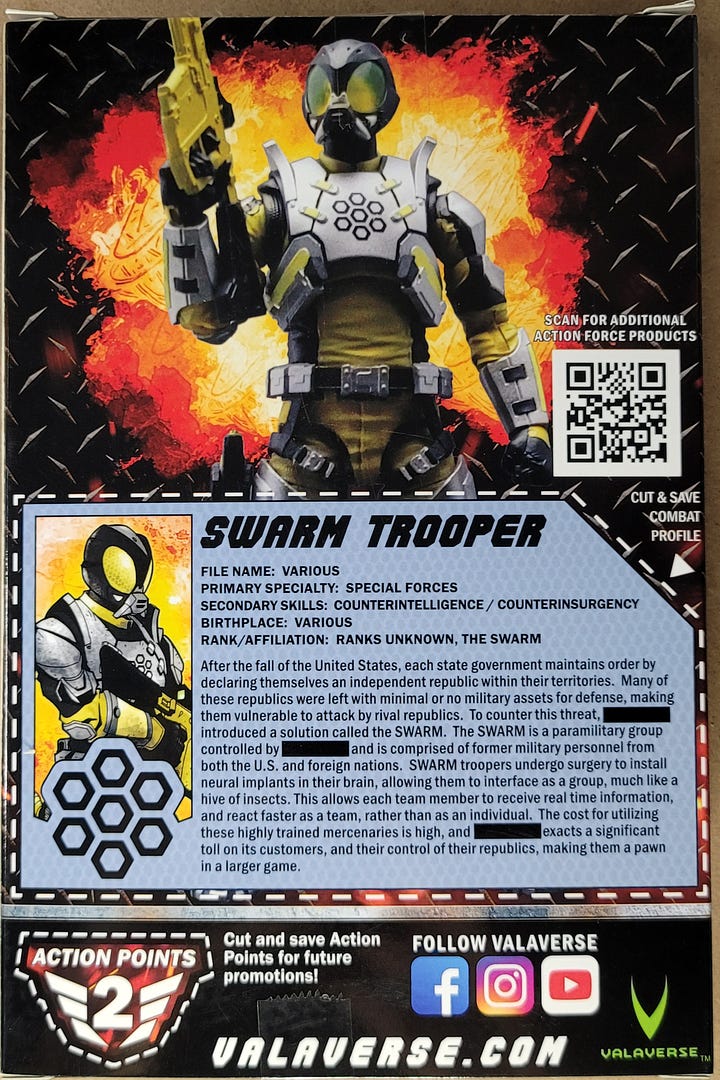 This is my first Valaverse figure. I’m gonna sidestep the whole toxic G.I. Joe vs. Action Force fandoms which I know next to nothing about except that it’s out there. Why be angry about toys? They’re supposed to be fun. Generally the Action Force line of militia-styled figures have next to no appeal to me, but then there’s this SWARM Trooper.