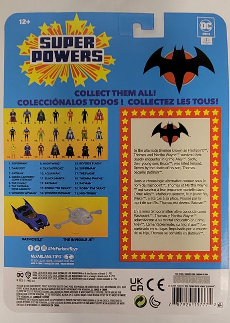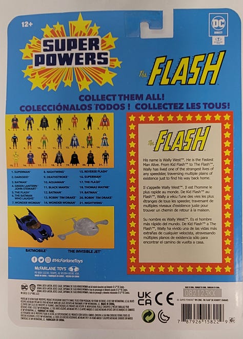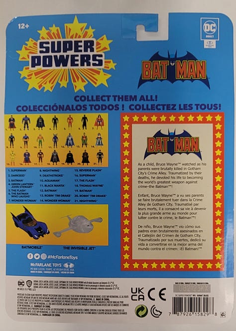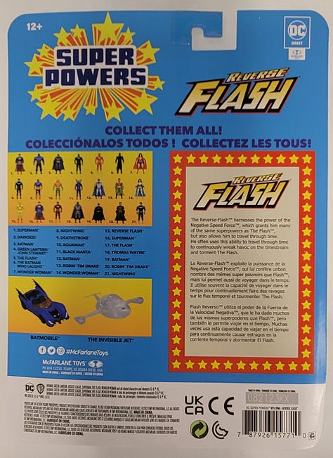 What is intriguing is that this wave is the largest wave of McFarlane’s Super Powers by far. Not just these 7 figures (as promoted in the cross-sell on the back) but the wave also includes the Peacemaker/Judomaster/Vigilante 3-pack (to be covered in part 2) and the Whirly-Bat vehicle. The first three waves were 3 figures a piece, with wave four jumping to 5 figures. That’s 14 figures over 4 waves, and wave 5 dumping another 10 figures on top of that.