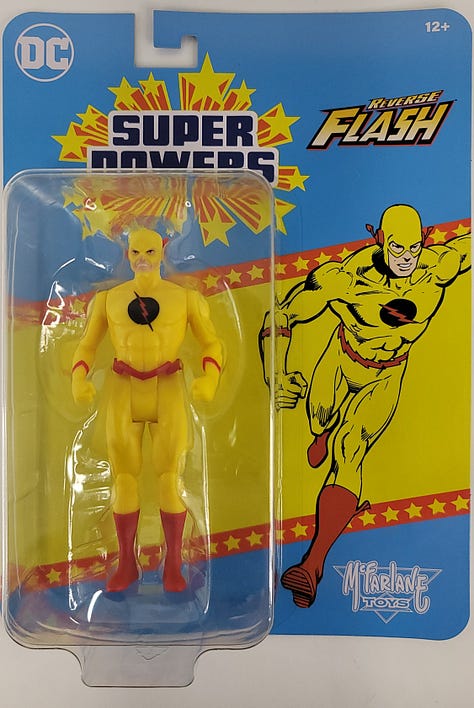 Reverse Flash is, aptly, the same sculpt just in reverse colour scheme. No complaints. Makes sense, and a new head sculpt, which, um, yay!