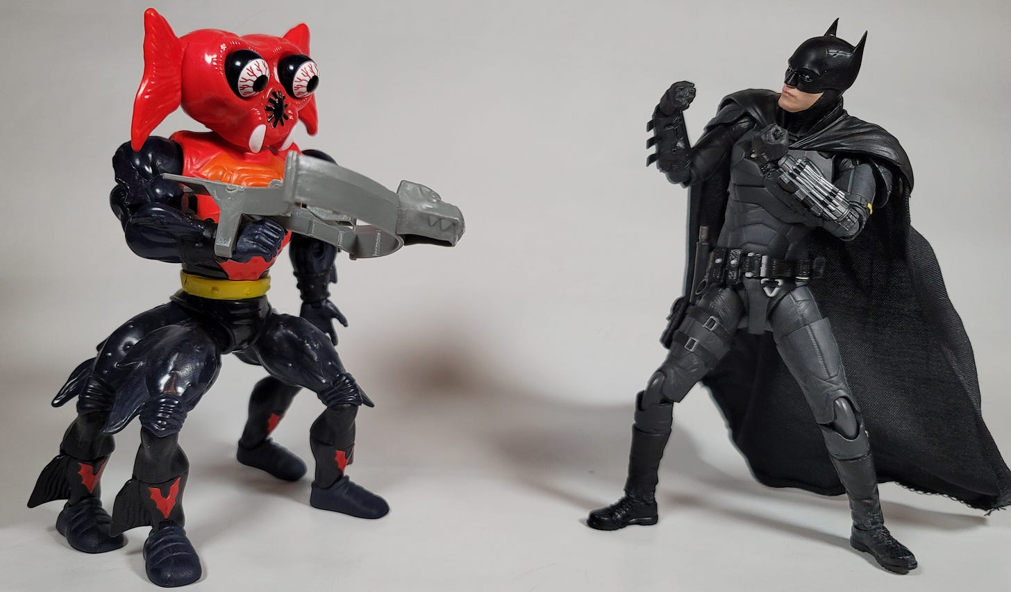 I had a blast messing around with this The Batman, even though he’s far from perfect. To me his legs are too short, his feet are too small and those knees…they’re weird. The figure comes with 6 sets of hands, an unmasked Robat Battenbat head, a switchable chest plate so it looks like he removed his batarang, and a few other doohickeys. The cape is wired (but a little frayed at the seams you may notice in the pics), and I’m still learning how to deal with wired things.