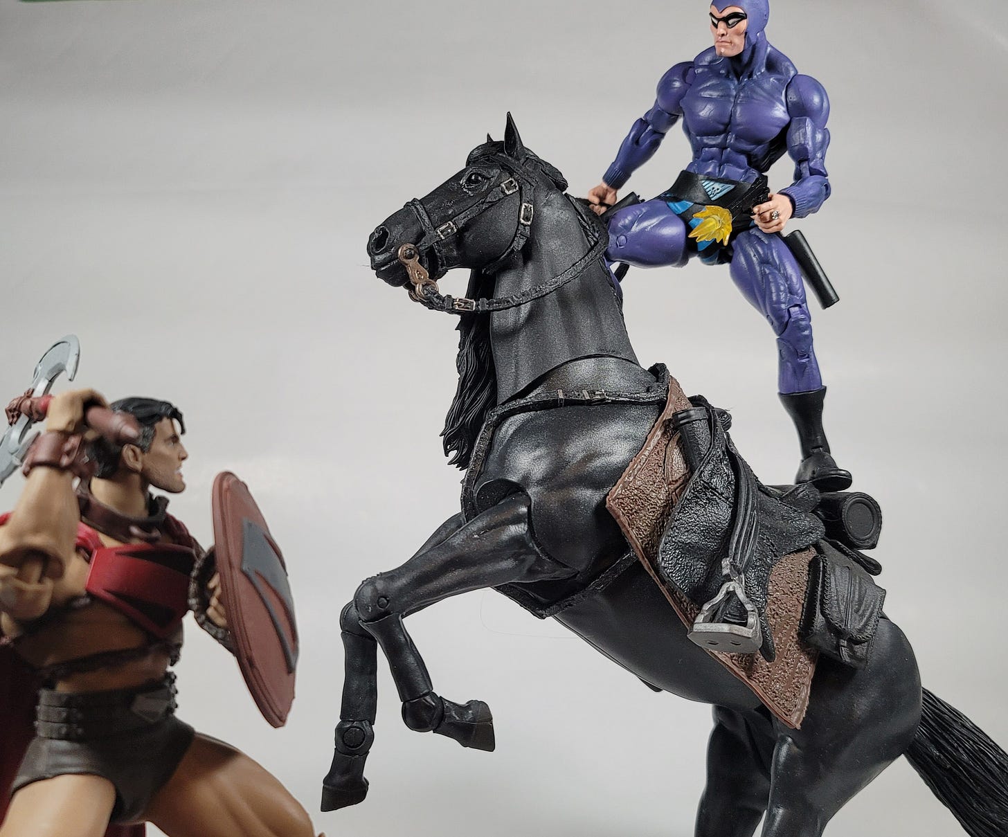 It’s a beautiful, powerful body sculpt. The articulation is good but the joints are great. The colours are just wow-inducing, and the face sculpt and paint apps look so good. He comes with his two pistols with add-on firing effects, a whip with a bendy wire (again, not great at working with bendy wires yet), and many hands (each with a sculpted skull ring on them). We got the Witcher “Roach” horse earlier this year just to have a horse, and he’s since become the Phantom’s horse. He looks good without it but he looks better with it. I know I’ve seen the Phantom riding a horse…somewhere.