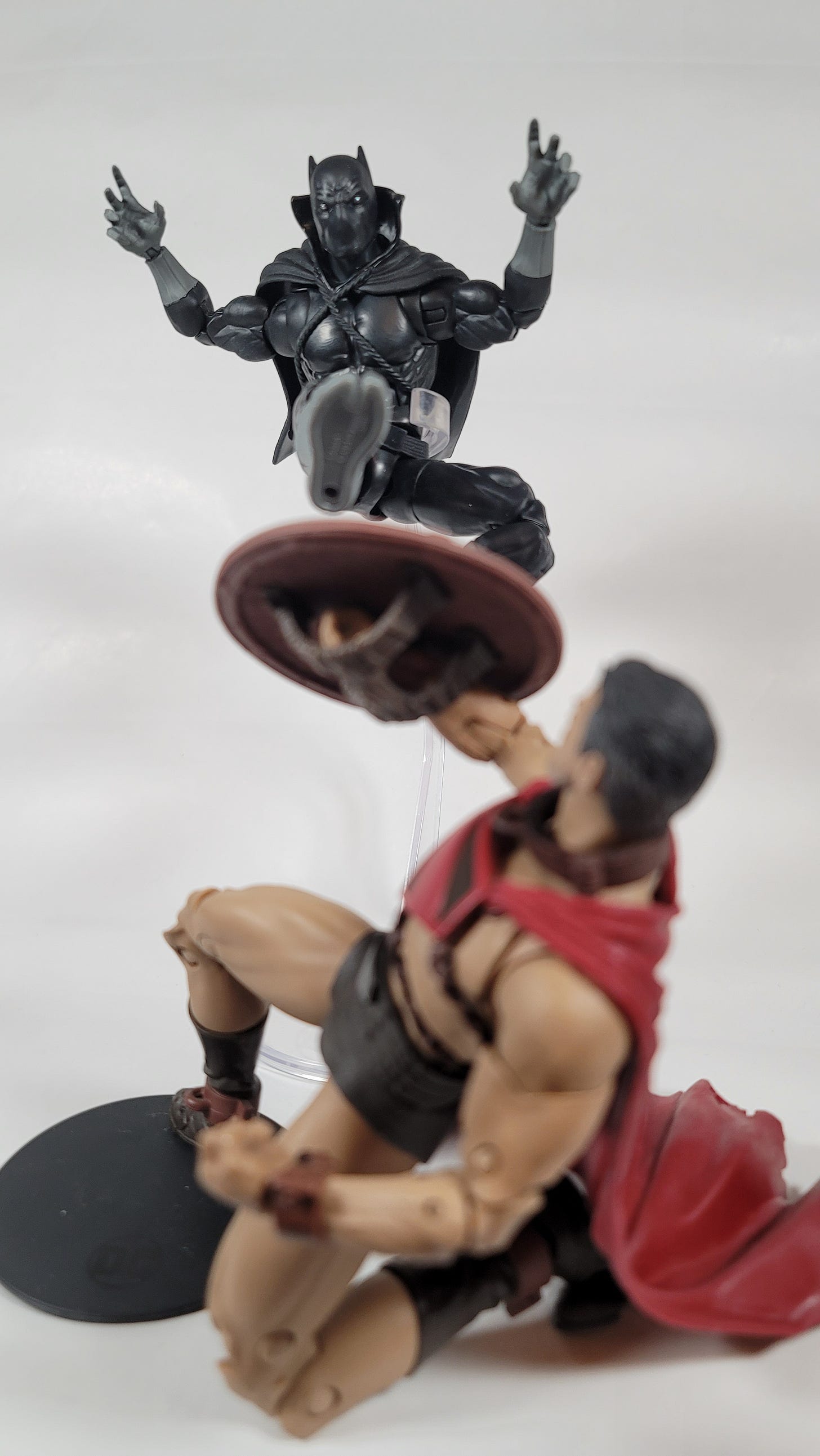 I don’t know all the different bucks used for Legends, but this is definitely a newish one and it’s pretty amazing. He still can get into a full hand on the ground crouch/crawl, but the agility is still pretty fabulous. The plastic half-cape looks great and never gets in the way, and the grey gloves/boots with sculpted ridges are fabulous. Plus open claws and alternate fists. He’s just so much fun to mess with. And, yeah, I know my photo skills aren’t to hot, so I can’t capture Panther’s eyes here correctly, but they’re steely and kind of shine in the shadows. Really cool effect when you catch them right.